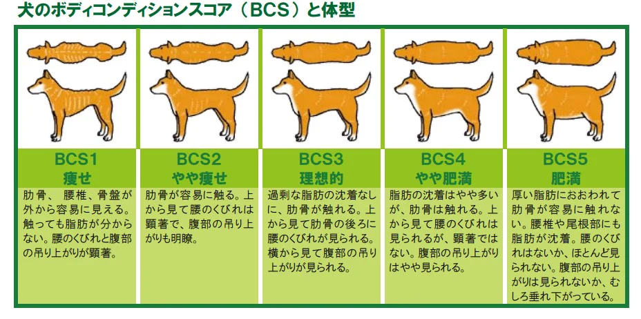 そこで活用したいのが、犬の体型を評価する世界共通の指標「BCS(ボディコンディションスコア)」です。